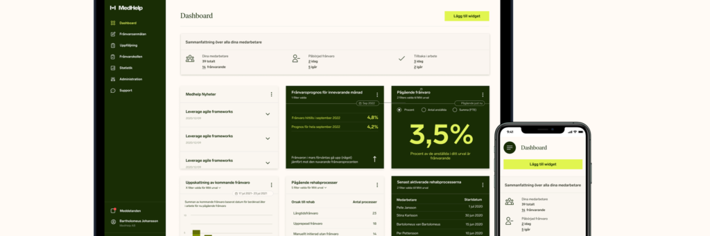 Dashboarden som finns i MedHelp Cares plattform är företagets unika vy över hälsoläget illustrerat med grafer som beskriver sjukfrånvaron just nu, sjukfrånvaroorsaker, utveckling över tid och sjukfrånvarokostnader. Den ger överblick, data och insikter baserat på företagets egen statistik. Det möjliggör analys, jämförelser och datadrivna underlag för att fånga upp risker och minska sjukfrånvaron i organisationen.