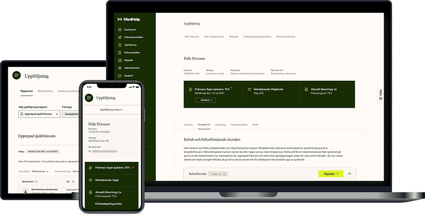 Sjukfrånvaro är dyrt och komplext. MedHelps plattform för digital företagshälsa hjälper er att upptäcka risker för ohälsa, hantera dem i tid och på så sätt begränsa sjukfrånvaron. Samtidigt gör våra tjänster det enklare att stötta sjuka medarbetare så att de snabbare kan komma tillbaka till jobbet. Plattformen möjliggör ett datadrivet arbete med sjukfrånvaro.